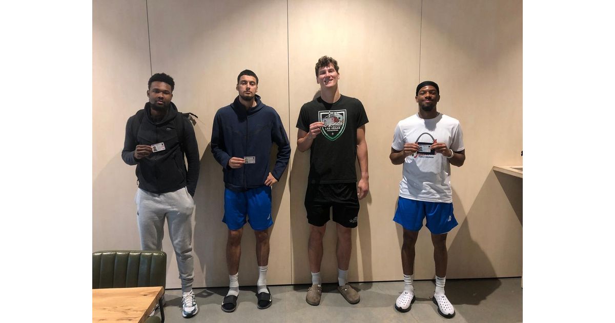 Op de foto poseren van links naar rechts Jordan Davis, Tajinder Lall, Patrick Cartier en Aaron Cook met hun vergunningen om te mogen werken en verblijven in Nederland. Het heeft even geduurd, maar uiteindelijk is het op tijd rondgeko