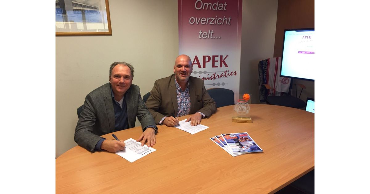Glunderende gezichten deze week bij de ondertekening van het verlengde businesspartnercontract van Zorg en Zekerheid Leiden Basketball en APEK Administraties. Het bedrijf van de broers Bert en Eimert van der Vliet, sponsors van het eerste uur in 2006 van het topbasketball in Leiden, heeft een handtekening gezet onder een verlengd contract tot juni 2019.