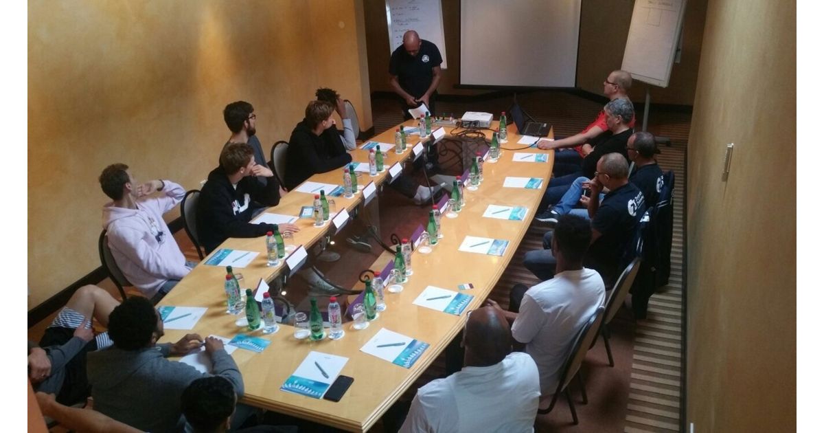 De selectie van Zorg en Zekerheid Leiden bevindt zich deze dagen in Luxemburg. Na het ontbijt kwam de groep vanochtend bijeen in een vergaderzaal. Hoofdcoach Paul Vervaeck doceert. De 'leerlingen' luisteren aandachtig.