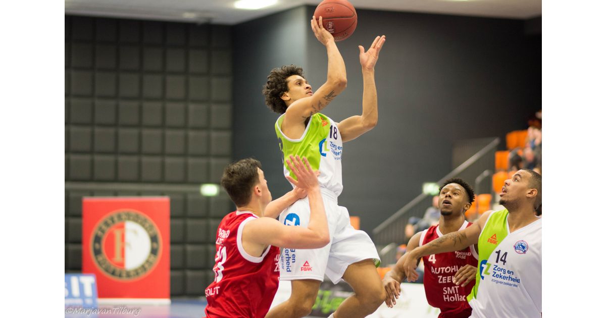 Zorg en Zekerheid Leiden gaf Feyenoord Basketball Rotterdam voor rust alle gelegenheid om tegen hoge percentages af te werken. Na rust trok de Leidse ploeg de touwtjes in de verdediging heel wat strakker aan. De Rotterdammers kwamen er nauwelijks meer doorheen, waardoor Zorg en Zekerheid Leiden de achtste opeenvolgende competitiewedstrijd in winst omzette: 80-91.