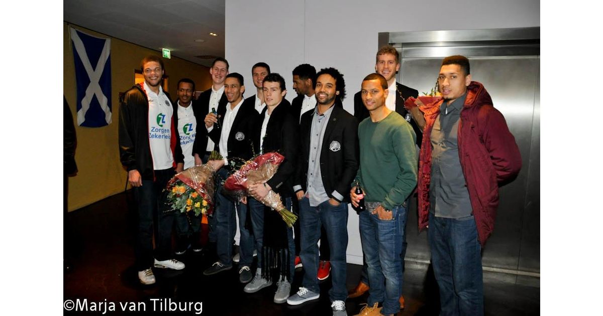 Op de foto van Marja van Tilburg staat Ajacied Ricardo van Rhijn, voor de derde maal op rij uitgeroepen tot Leids Sportman van het Jaar, tussen de spelers van Zorg en Zekerheid Leiden.
