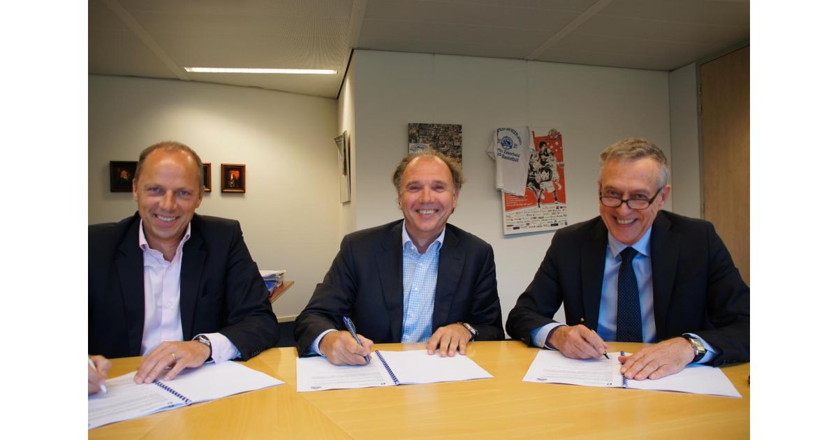 Op de foto tekenen Hennie Limberger, Marcel Verburg en Theo Knijnenburg (van rechts naar links) de driejarige overeenkomst.