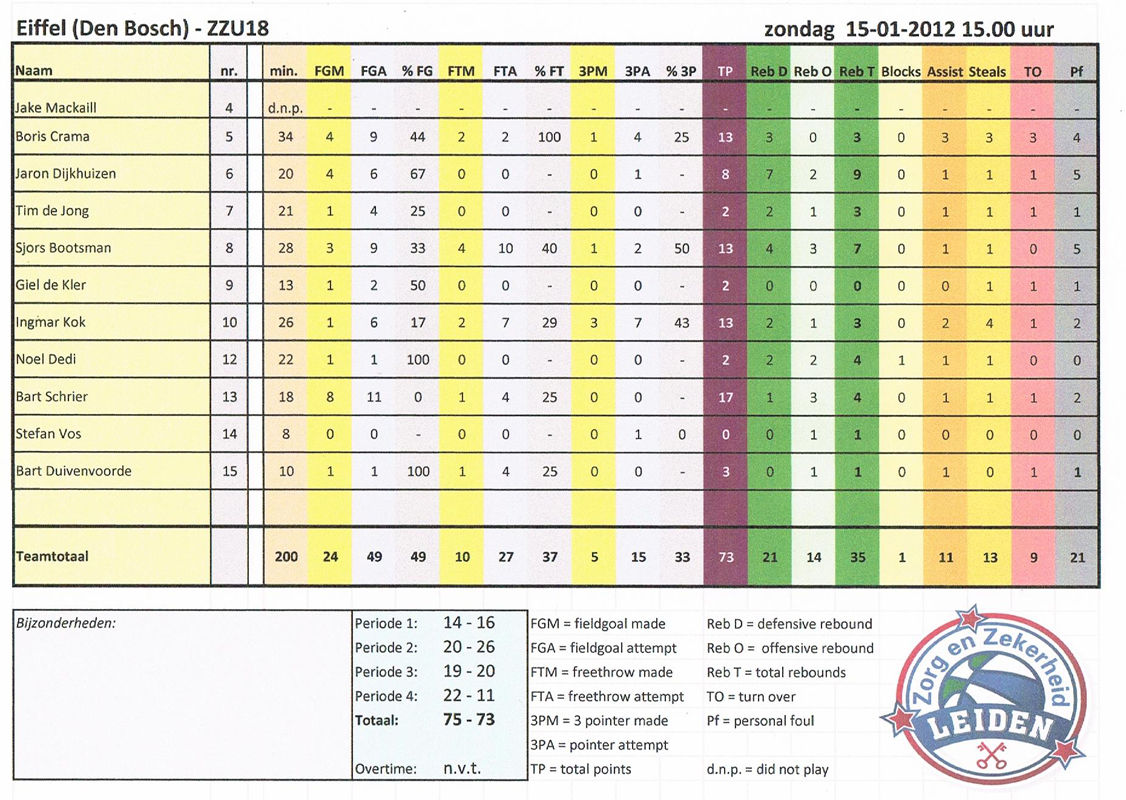Datum: zondag 15 januari 2012 · 15:00 Team: Locatie: Den Bosch