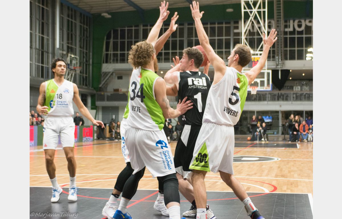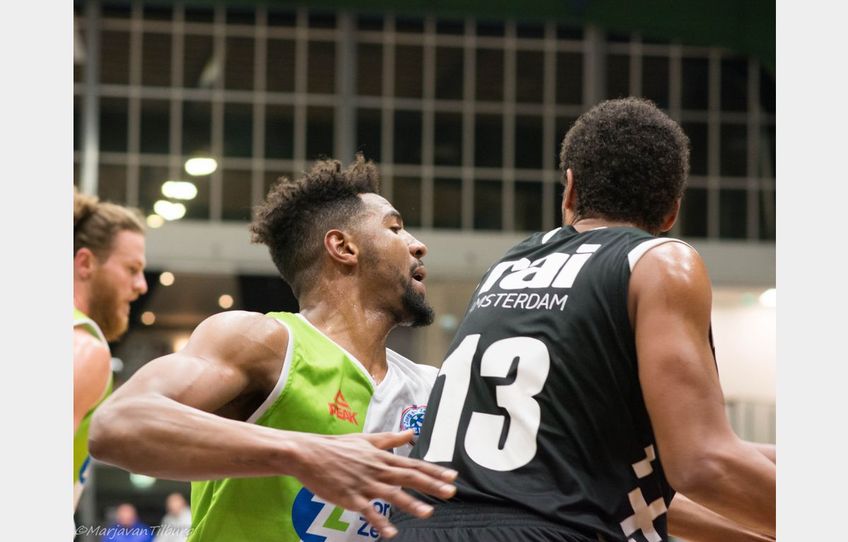 Misschien wat overmoedig begon Zorg en Zekerheid Leiden, dat nog geen 24 uur eerder uit Roemenië was teruggekeerd, aan het duel. Gesteund door een grote schare fans die de reis naar Amsterdam hadden ondernomen. Zij keken verbaasd op dat het na twee minuten spelen 8-0 voor Apollo stond. Clayton Vette en Worthy de Jong waren vervolgens actief voor de Leidse ploeg. Even plaatste Zorg en Zekerheid Leiden een 8-0 run met onder meer een dunk van Darius Thompson over Berend Weijs heen: 13-17. Dunken kan Weijs natuurlijk ook en dat zou hij maar liefst vier keer doen. Hij bracht zijn ploeg nog terug tot 18-18, maar het eindschot was voor Marijn Ververs en een dunk van Mohamed Kherrazi: 18-24. In de laatste aanval ging Dimeo van der Horst door zijn enkel en kon niet meer verder spelen. Zo bleven er voor de coaches Patrick Faijdherbe en zijn assistent Rogier Jansen nog zes spelers over. Dezelfde zes die zondag naar de Vijf Meihal moeten, aldus Faijdherbe.