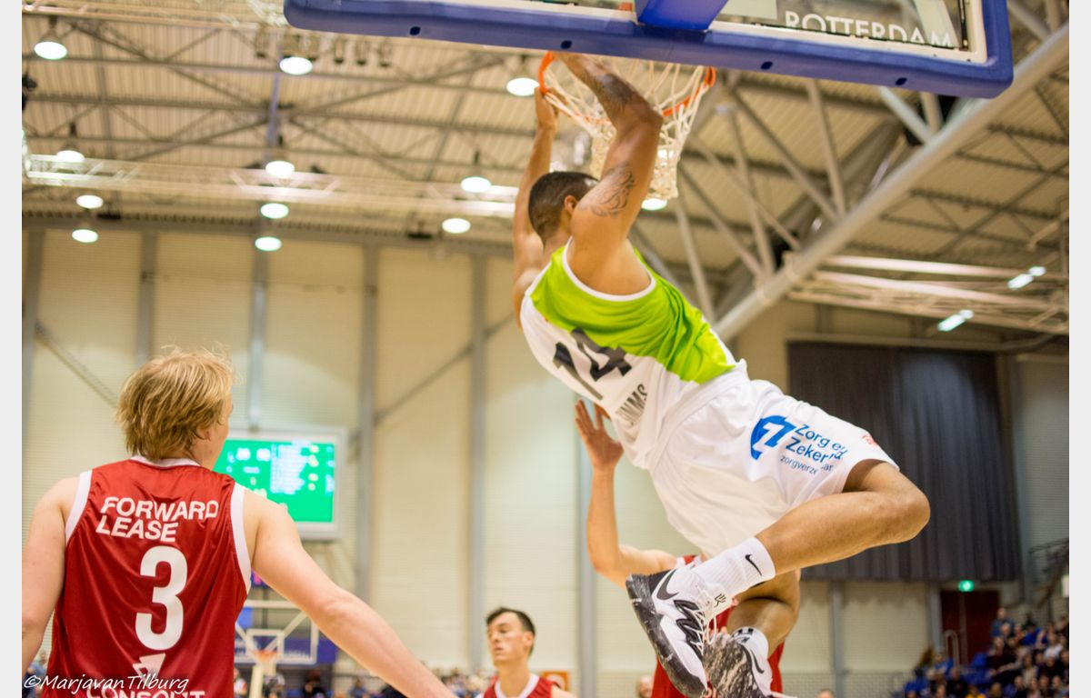 Zorg en Zekerheid Leiden heeft zich niet bovenmatig in hoeven spannen in Rotterdam. Feyenoord Basketball Rotterdam, dat weliswaar verre van compleet was, werd op een dikke nederlaag getrakteerd door de Leidse ploeg, waar Kenneth Simms ook weer mee mocht doen. Via een ruststand van 30-43 werd het 58-97 voor de koploper van de Dutch Basketball League.