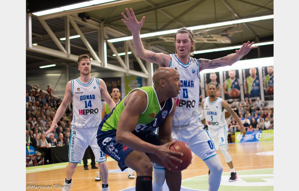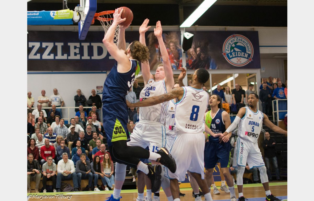 Donar zag het gevaar en vergrootte de marge weer. In de tweede minuut van het laatste kwart betekende een drietje van Grant Sitton 55-71 en was de nood aan de man voor de Leidse ploeg. Na bommetjes van Watson en De Jong en een and-1 van Sergio De Randamie (vooraf gehuldigd als speler van de maand maart) was het na vier minuten 64-74.