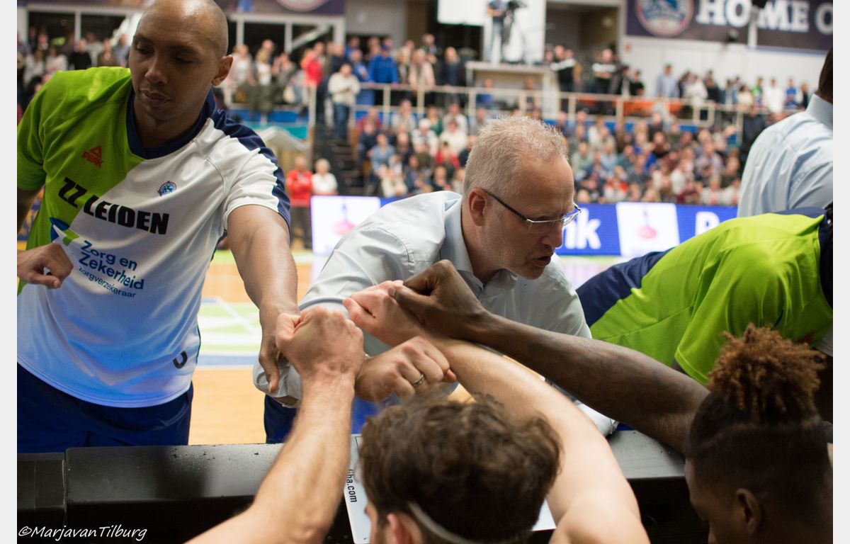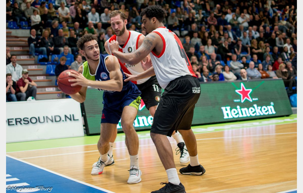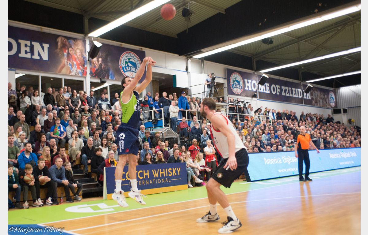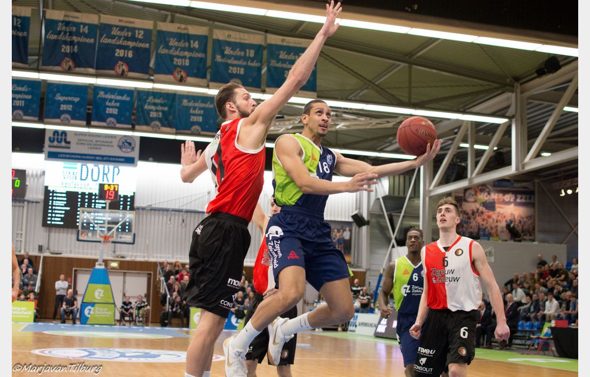 Zeeuw & Zeeuw Feyenoord kwam goed uit de kleedkamer. Via twee goed uitgespeelde driepunters van Coen Stolk en Quentin Snider was het opeens 57-41. Rolf Franke onderkende het gevaar en haalde zijn manschappen direct naar de kant. De Leidse ploeg zocht weer de weg naar de ring (vrije worpen van De Jong en Williams) en als daar te veel op geholpen werd, dan was daar Pasalic met zijn derde en later vierde driepunter. Het verschil werd weer snel boven de twintig punten getild. Het in groten getale opgekomen publiek kreeg waar voor zijn geld. Zeker toen Huggins een alley-oop pass van Tayler Persons hard door de ring dunkte: 68-45 halverwege het derde kwart.