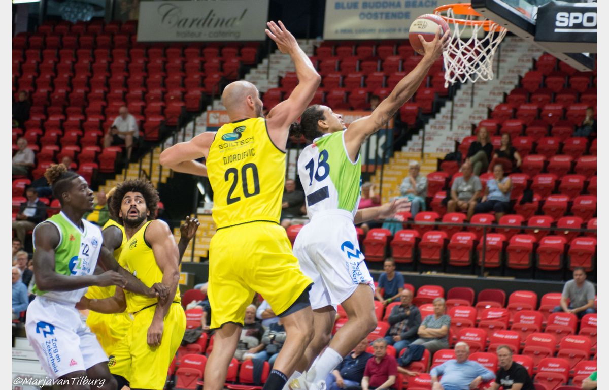Huggins, afgelopen zaterdag nog topscorer, kwam er in Oostende nauwelijks aan te pas. De schutter eindigde met 6 punten. De Jong speelde een sterke pot. Hij sloot het duel af met 27 punten en 7 assists. Persons kwam tot 17 punten (12 na rust) en Williams eindigde met 10 punten en 7 rebounds.