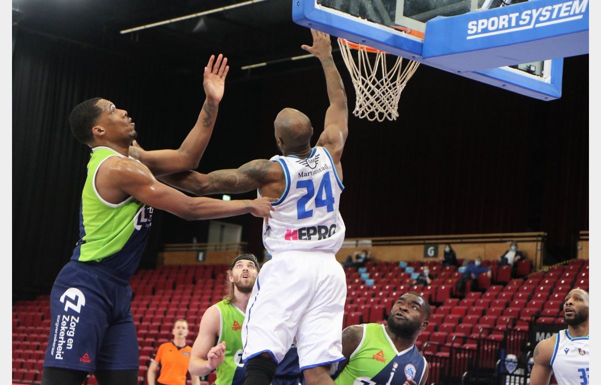 Ook in het tweede kwart denderde de Leidse trein door. Binnen twee minuten was Michael Finke twee keer succesvol van afstand om het verschil boven de 20 punten te brengen. Onder aanvoering van Jarred Ogungbemi-Jackson en Willem Brandwijk deed Donar even wat terug. Met nog 3’39 te spelen, was het 28-43. Zorg en Zekerheid Leiden herstelde de marge vrij snel. Finke was goed voor zijn derde driepunter, Giddy Potts (te zien op een van de foto’s van FotoKlick Fotografie) droeg ook nog twee bommetjes aan. Na een aanvallende rebound van Ververs probeerde hij vanuit een kansloze positie te schieten. Niettemin haalde Ververs het maximale eruit door een fout uit te lokken en zijn twee vrije worpen raak te schieten voor een ongekende ruststand van 33-58. Als je 10 uit 15 driepunters raak schiet, wil dat ook wel lukken.