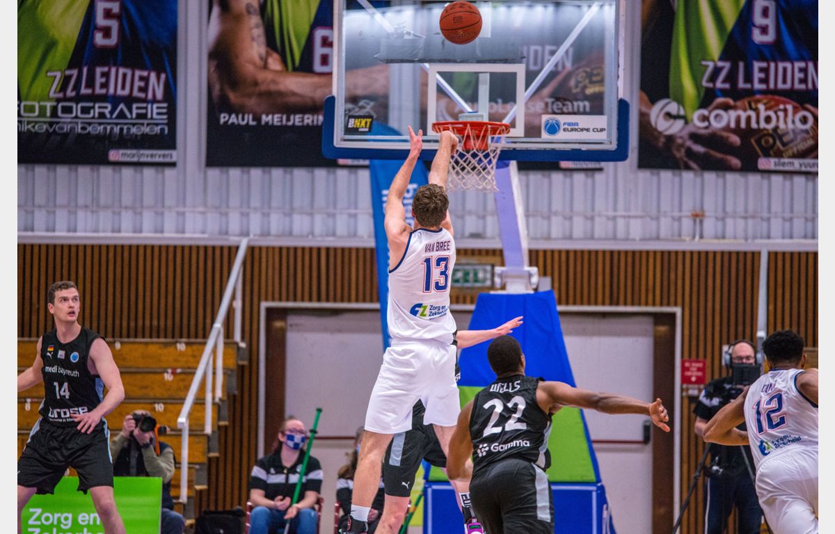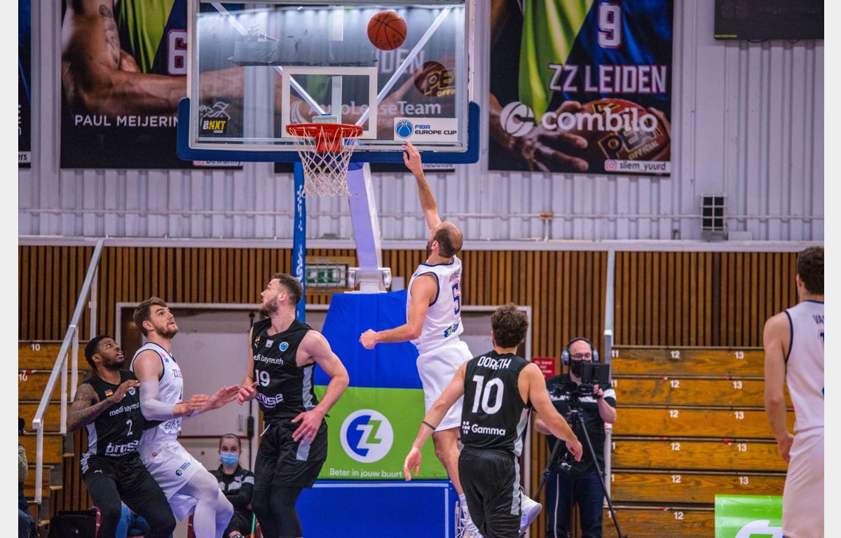 Zorg en Zekerheid Leiden ligt op koers voor een plek in de kwartfinale van de FIBA Europe Cup. Voor de tweede keer was de Leidse ploeg te sterk voor het Duitse medi Bayreuth: 98-93. Door goed spel begon de Leidse ploeg aan het laatste kwart met een voorsprong van 21 punten. De Duitse opponent kwam in de slotfase nog terug tot 4 punten (95-91), maar Zorg en Zekerheid Leiden bleef, aangemoedigd door een fanatiek publiek, overeind.