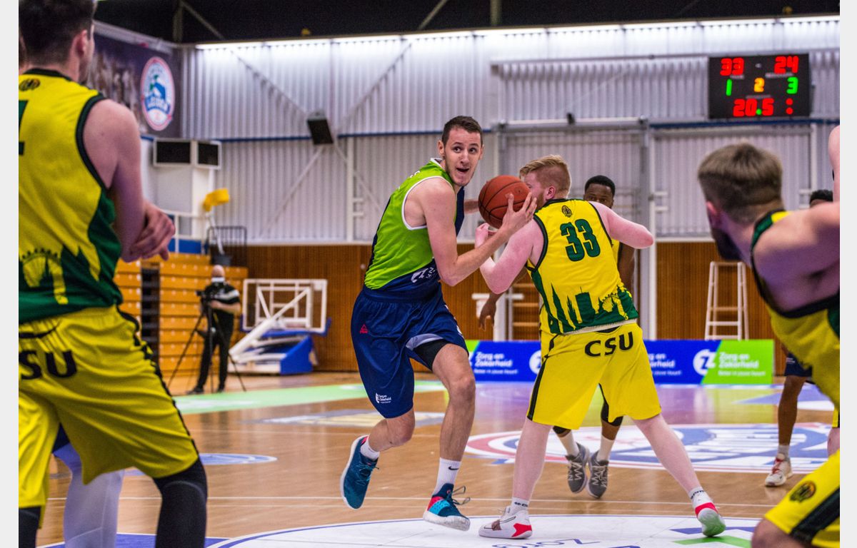 De vierde en laatste wedstrijd van dit seizoen tegen The Hague Royals kende een aarzelende start. Zorg en Zekerheid Leiden had moeite om de gaten in de Haagse verdediging te vinden, al was dat andersom ook zo. Halverwege het kwart stond het 8-6 voor de Leidse ploeg en had alleen Asbjørn Midtgaard zich al nadrukkelijk laten zien. Na een driepunter van Einaras Tubutis scoorden de Royals vijf punten op rij. Via Jhonathan Dunn en Luuk van Bree werd het eerste kwart bij 16-13 alsnog in Leids voordeel afgesloten.