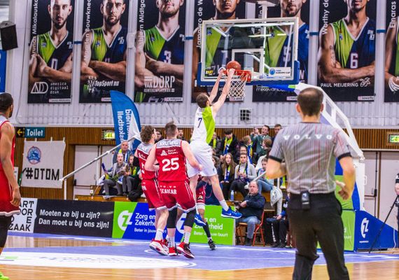 De Jong werd met 18 punten (allemaal na rust gemaakt) topscorer bij Zorg en Zekerheid Leiden. Tubutis en Dunn (6 assists) kwamen allebei tot 15 punten. Midtgaard kwam niet verder dan vier punten, maar pakte wel 13 rebounds en blockte vijf schoten. Volgende week zaterdag staat de return op het programma.