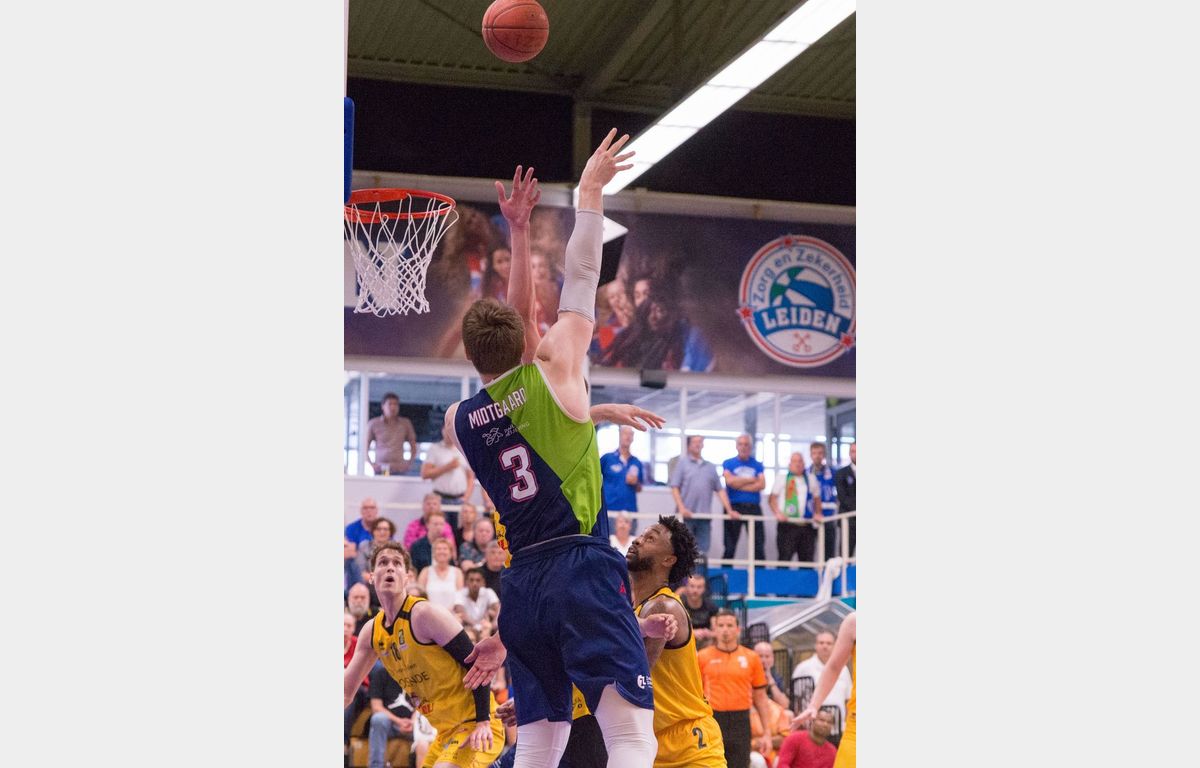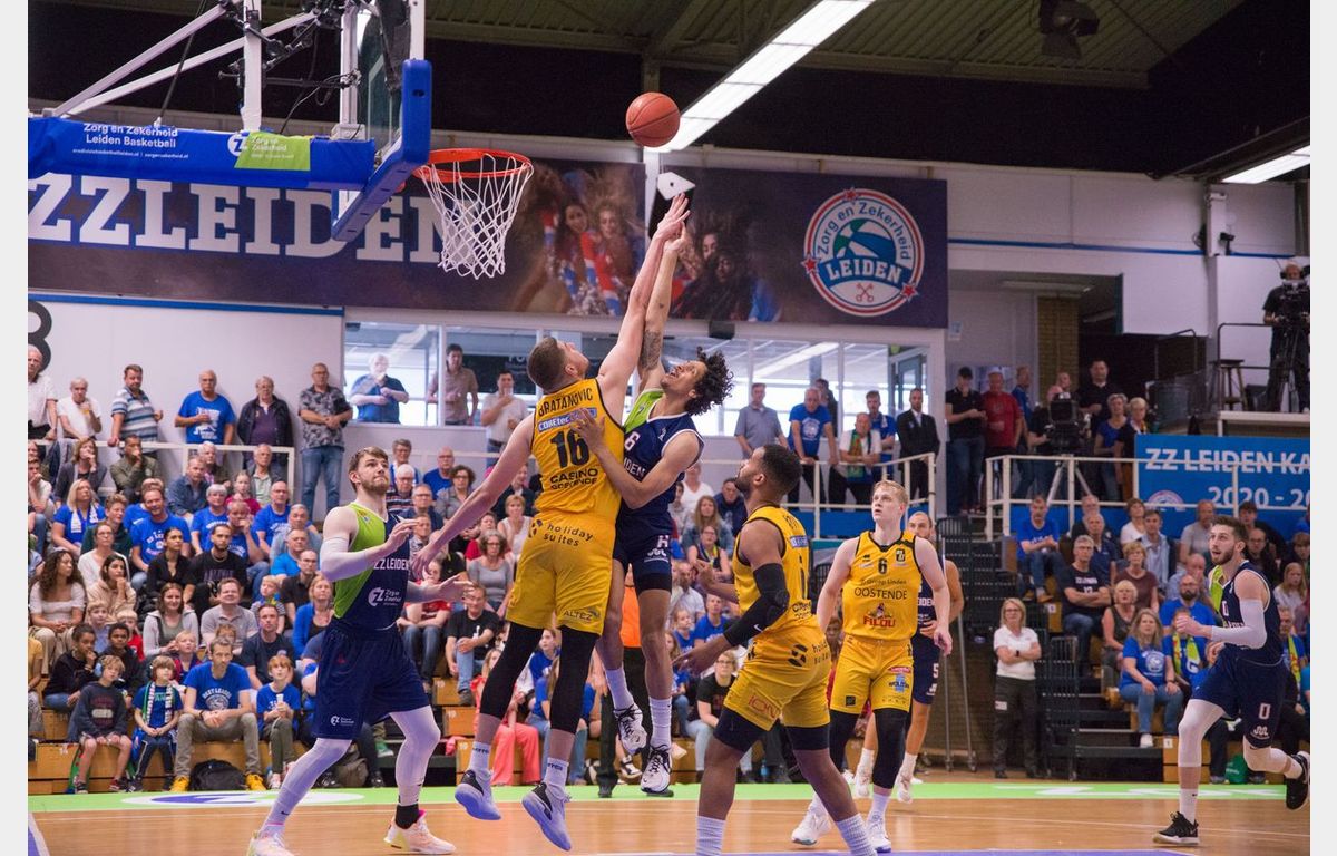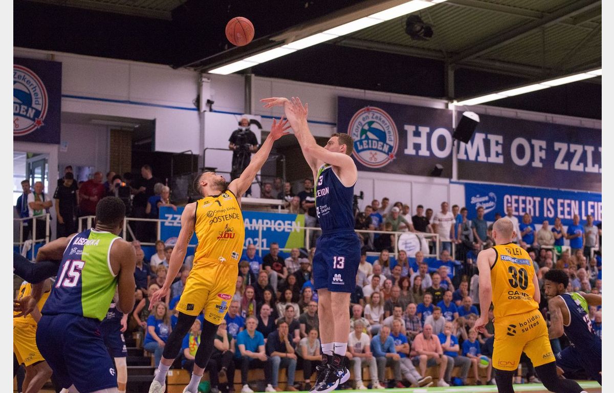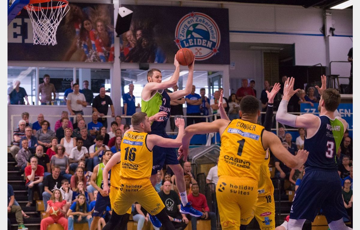 Zorg en Zekerheid Leiden, dat 20 aanvallende rebounds pakte en daar 22 punten uit scoorde, reist dinsdag dus naar Oostende af met een geringe voorsprong. Er mag met één punt verloren worden. Een nederlaag met twee punten betekent verlengen. Bij elke andere nederlaag valt het doek voor Zorg en Zekerheid Leiden. Arunas Mikalauskas werd topschutter met 18 punten. Voor Worthy de Jong waren er 14 punten, 8 rebounds en 5 assists. Jhonathan Dunn kwam tot 13 punten.