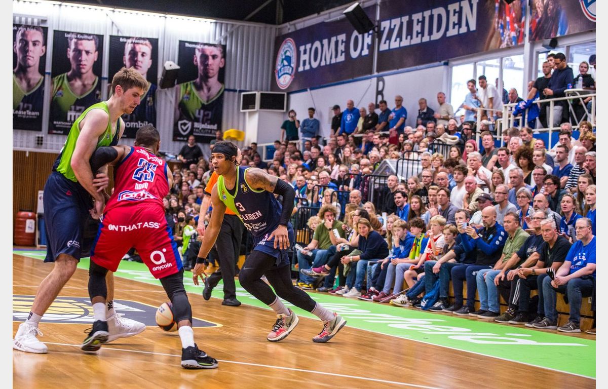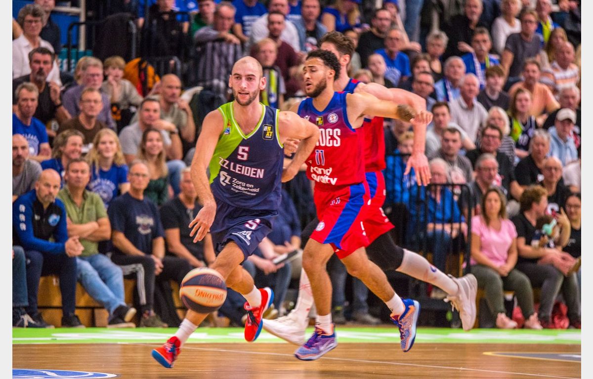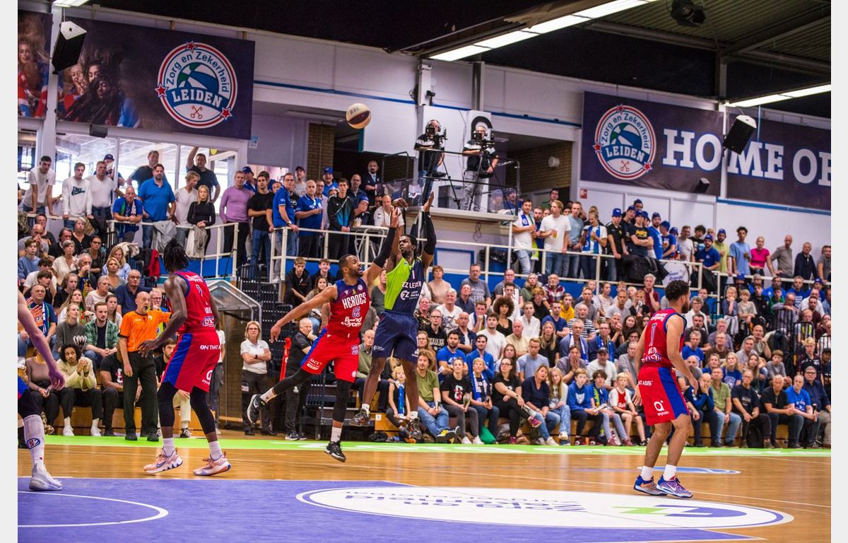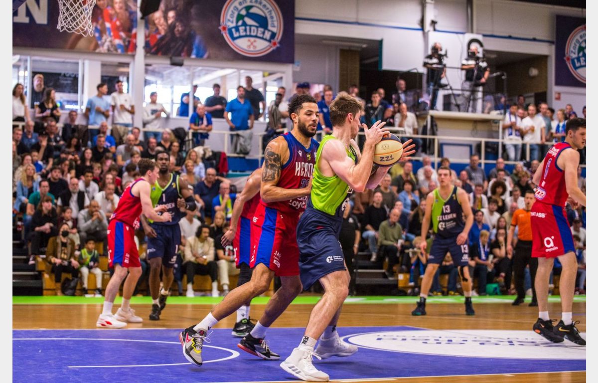 De Vijf Meihal was afgeladen. Veel mensen waren naar de hal gekomen om het afscheid van Worthy de Jong mee te maken. Daar moesten ze nog wel even opwachten, want eerst was er nog de confrontatie tussen Zorg en Zekerheid Leiden en Heroes Den Bosch, de twee nog ongeslagen ploegen in het Nederlandse deel van de BNXT League. Zorg en Zekerheid Leiden kende een prima start van de klassieker. Luuk van Bree opende met een driepunter en ook Deion Hammond wist van ver twee keer raak te knallen. De Leidse ploeg nam een voorsprong van acht punten. Een halve minuut voor het einde van het eerste kwart bracht Maarten Bouwknecht met een drietje het verschil op 9 punten. Keime Helfrich besloot het kwart met een driepunter voor Heroes Den Bosch: 28-22.