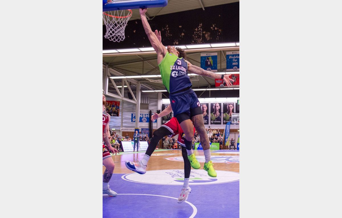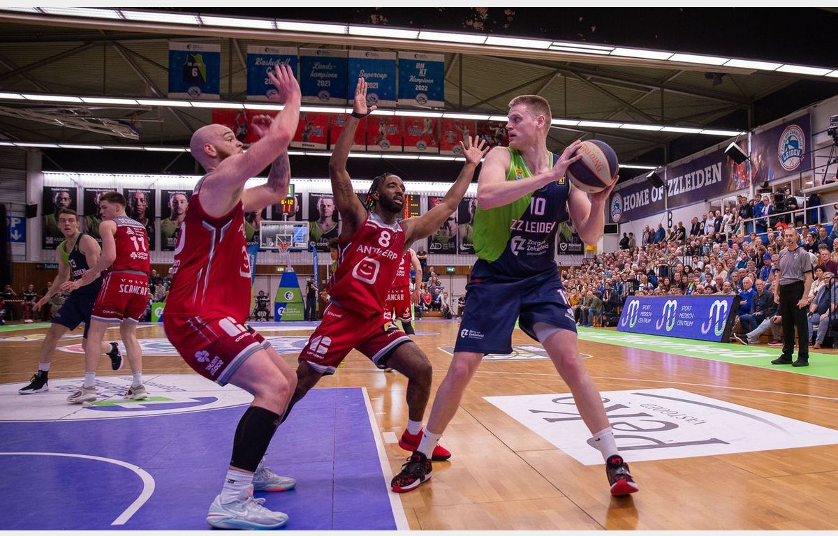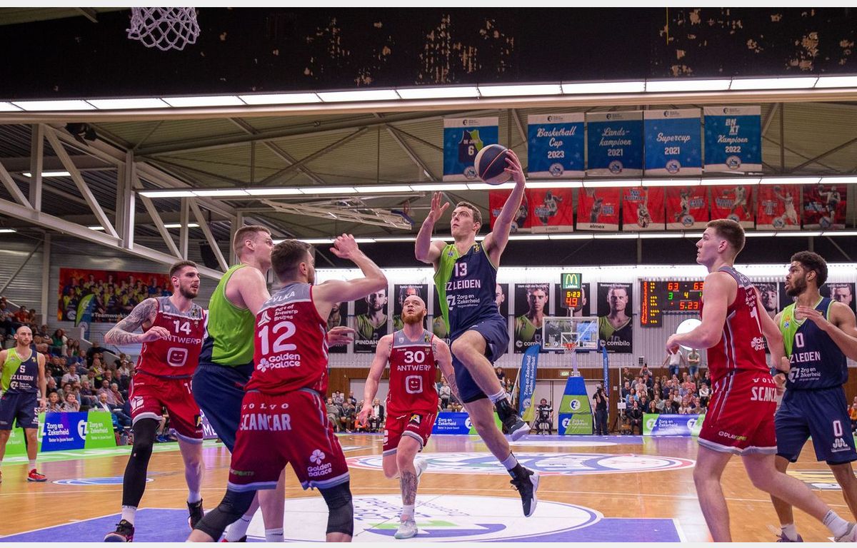 De Leidse ploeg wilde het daar niet op aan laten komen. Halverwege het eerste kwart kreeg Zorg en Zekerheid Leiden het publiek op de banken. David Collins dunkte snoeihard raak, waarna in de volgende aanval Deion Hammond een van zijn vijf rake driepunters binnen schoot voor 15-10. Telenet Giants Antwerp kwam net zo snel weer terug, zodat het na 10 minuten 20-20 stond.