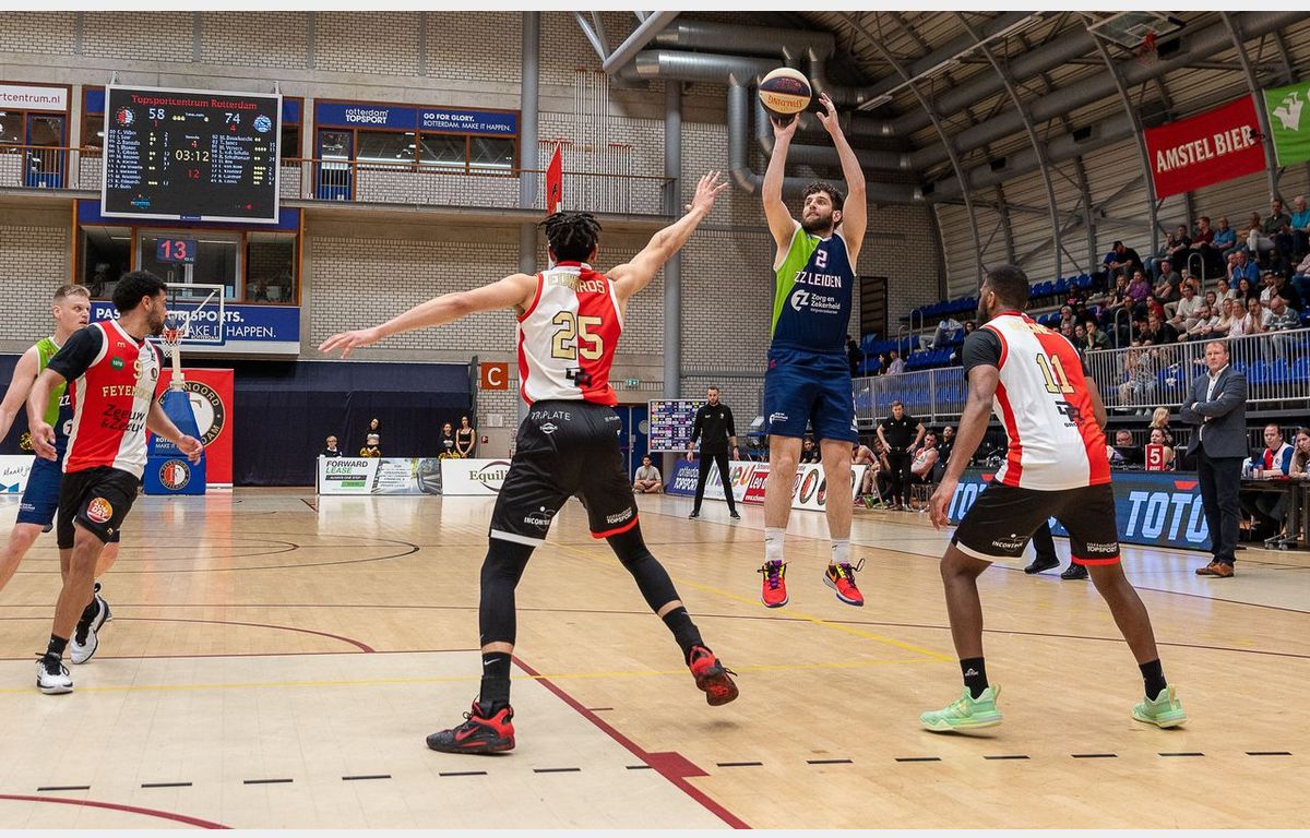 Zorg en Zekerheid Leiden kon zich vrijdagavond in Rotterdam plaatsen voor de halve finale van de nationale play-offs. Dan moest er wel gewonnen worden van Zeeuw & Zeeuw Feyenoord Basketball dat voor zijn laatste kans vocht. Roeland Schaftenaar en Brock Gardner pakten in het eerste kwart uit met ieder twee driepunters, al werd één driepunter op de scouting toegewezen aan Tajion Jones. Dat leidde na de enige score deze wedstrijd van Luuk van Bree tot een 12-18 voorsprong met nog anderhalve minuut te gaan in het eerste kwart. Daar waren aan het einde van dat kwart nog drie punten van over: 17-20.