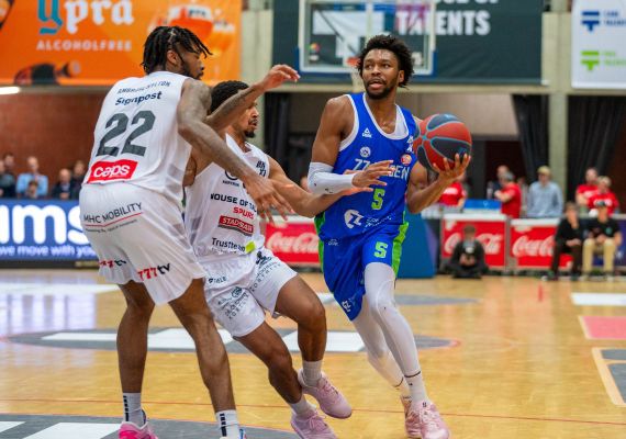 Niks aan het handje, zou je zeggen. Die kant leek het aanvankelijk ook op te gaan. Mede door een driepunter van de goed spelende Dimitri Maconda pakte ZZ Leiden na drie minuten een 22-35 voorsprong. Daarmee was de Leidse koek op, want alleen Scott-Grayson wist tot de rust nog een keer te scoren. De snelle Darren Williams bezorgde de Leidse verdediging handenvol werk. De Amerikaan kreeg vervolgens hulp van de in Amerika opgeleide Noël Coleman. Bij rust was de Leidse voorsprong verdampt tot één punt: 36-37.